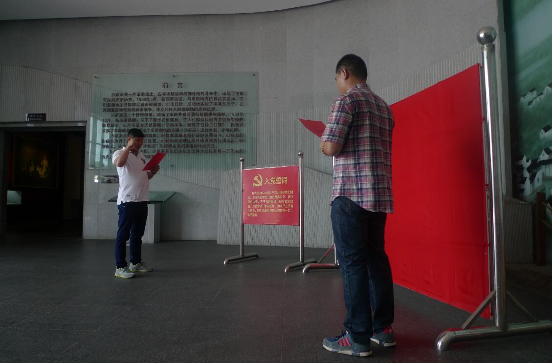 在沙家浜抗日紀念館,新入黨的張仕恩同志面對黨旗莊嚴宣誓,全體黨員也面對著黨旗重溫入黨誓詞,莊嚴向黨宣誓,表達了對黨的忠誠和信仰。短短一天的行程,東進橋、抗日司令部、民俗街、葉飛委員長題詞的照壁、軍民魚水情主題雕塑等等都給我們留下了深刻的印象。